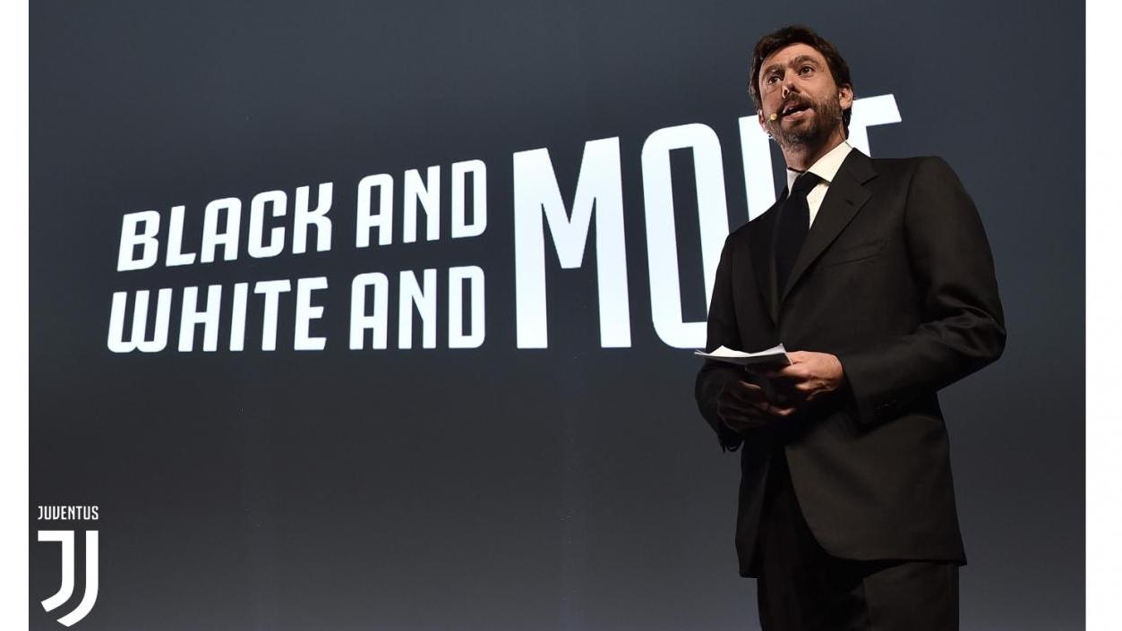 Presiden Juventus, Andrea Agnelli, saat memperkenalkan logo baru klub.