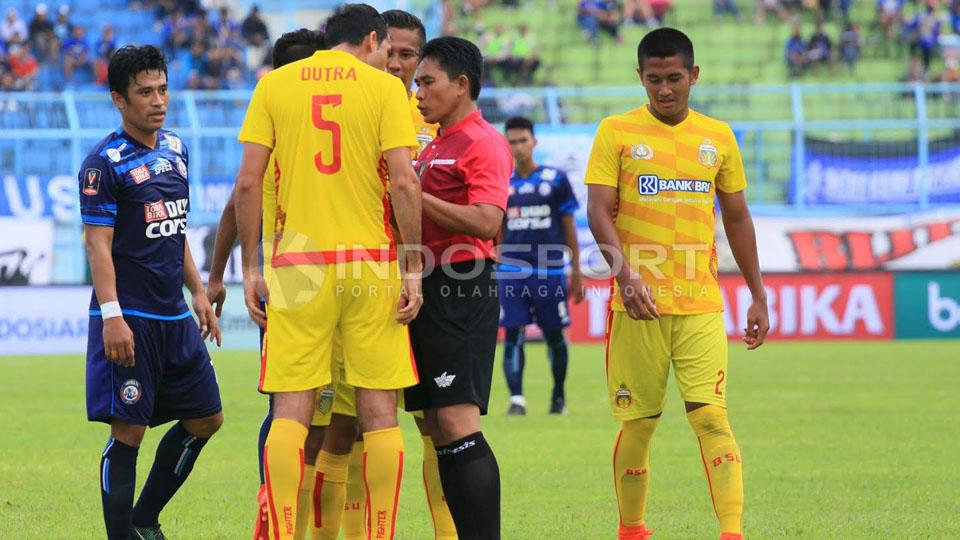 Pemain Bhayangkara FC melakukan protes pada laga melawan Arema FC.“Lini depan memang kurang maksimal. Pelatih yang lebih tahu hal itu, dan sebagai pemain kita fokus pada diri sendiri,” tandasnya.