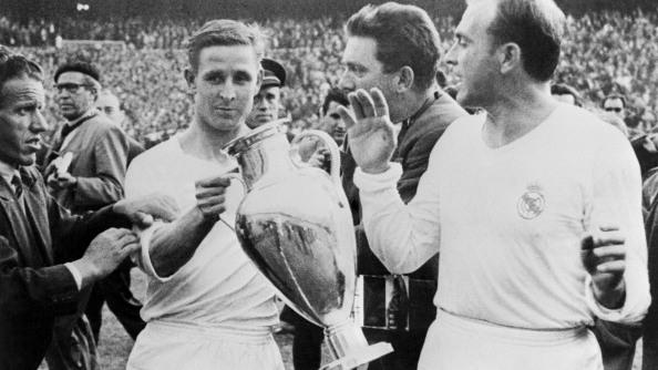Raymond Kopa, bersama Alfredo Di Stefano, memegang Si Kuping Besar setelah mengalahkan Fiorentina di final Liga Champions 1957.Setelah pertemuan itu, Kopa berseragam Los Blancos dan membela El Real di tiga final European Cups beruntun.