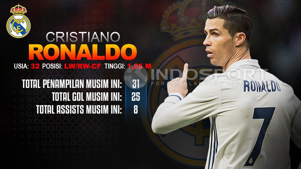 Seperti biasa, Ronaldo akan diplot di posisi penyerang sayap dan akan tetap dimanjakan oleh umpan-umpan dari rekan setimnya untuk mencetak gol. Sejauh musim ini, pemain Timnas Portugal ini sudah mencetak total 25 gol dan 8 assists dari 31 laga musim ini bersama Los Blancos.