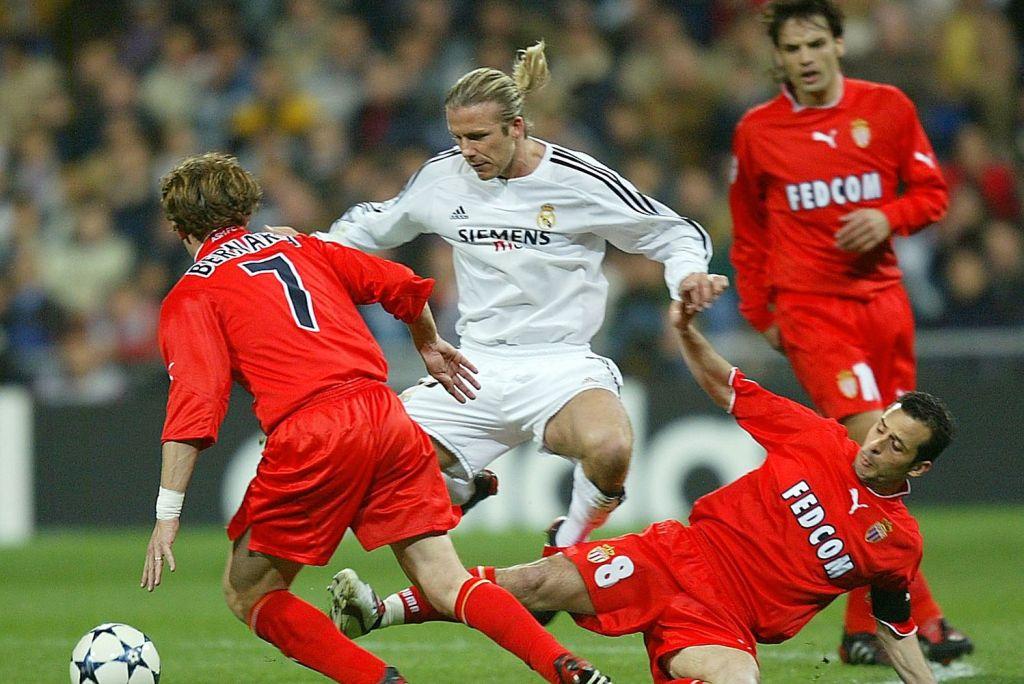 David Beckham (tengah/Real Madrid) saat dikepung oleh para pemain AS Monaco di babak 8 besar Liga Champions 2003/04.Pada leg kedua, Madrid memang boleh mendapat keunggulan lebih dulu melalui Raul di menit ke-36. Namun, sebuah gol penyeimbang di menit akhir babak pertama oleh Ludovic Giuly seakan menjadi awal kebangkitan bagi Monaco.