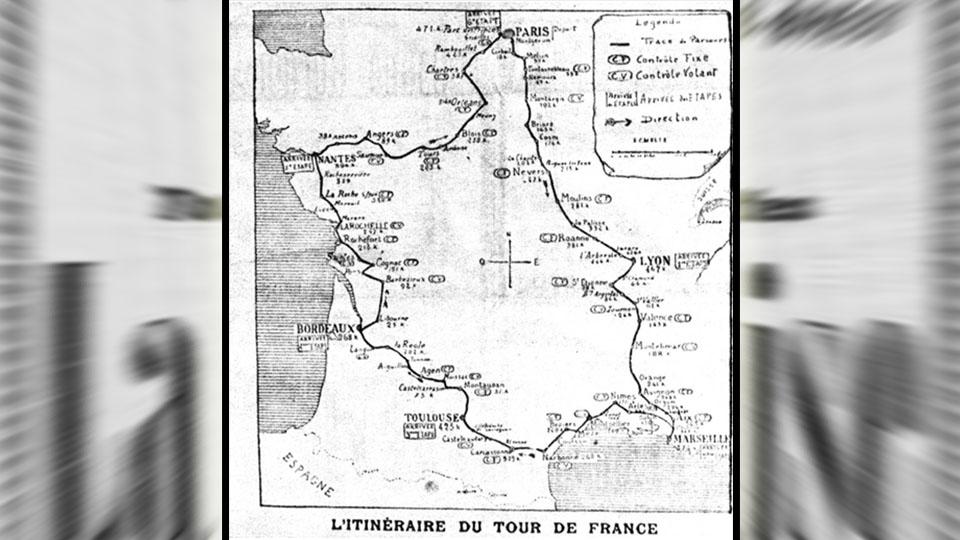 Rute Tour de France edisi perdana pada tahun 1903 yang menempuh jarak 2.428 kilometer.Mereka bersepeda menembus pekatnya malam dengan penerangan seadanya. Sebagian bahkan menyebut bahwa mereka tengah bersepeda dalam keadaan tidur karena bahayanya medan yang ditempuh.