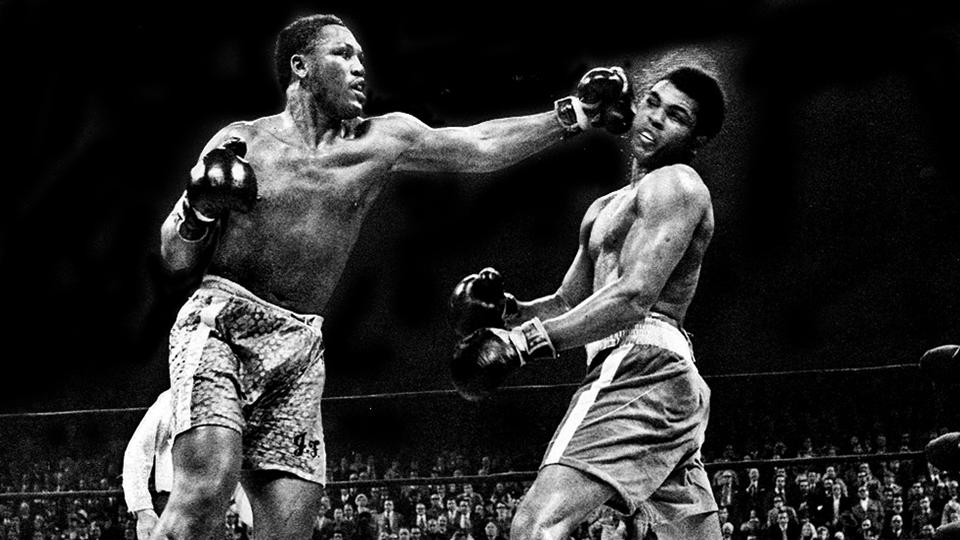 Muhammad Ali saat dihantam pukulan dari Joe Frazier