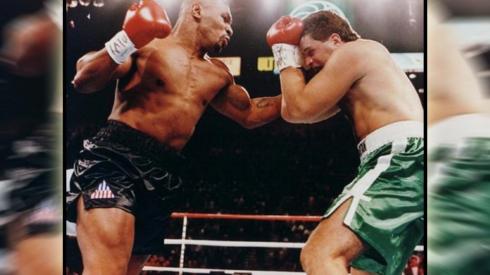Pukulan Mike Tyson menghantam wajah Peter McNeeley.